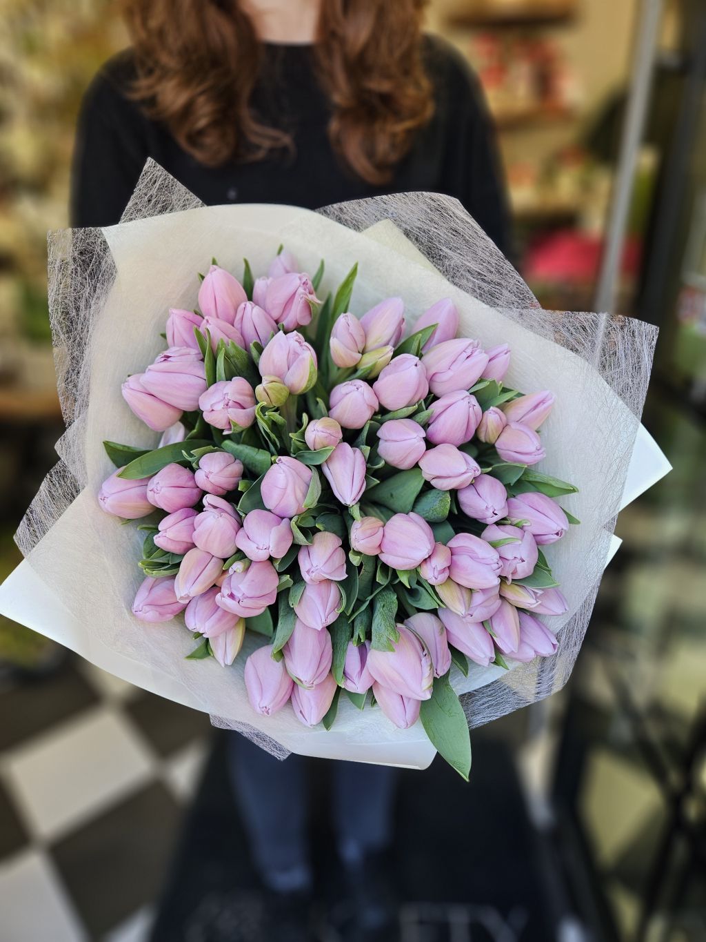 Čerstvá kytica z tulipánov 50ks previazaná v hodvábnom papieri.