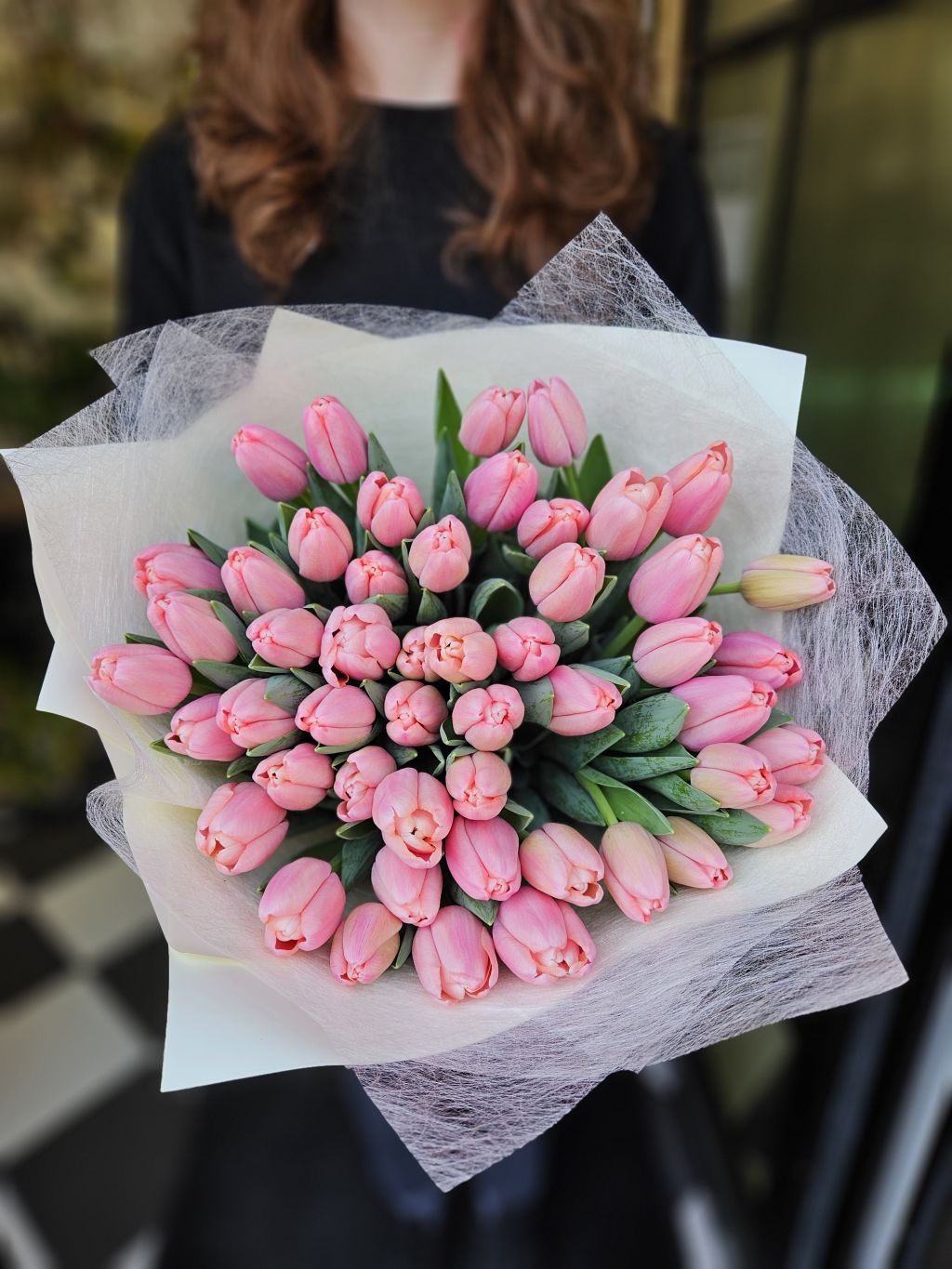 Čerstvá kytica z tulipánov 50ks previazaná v hodvábnom papieri.