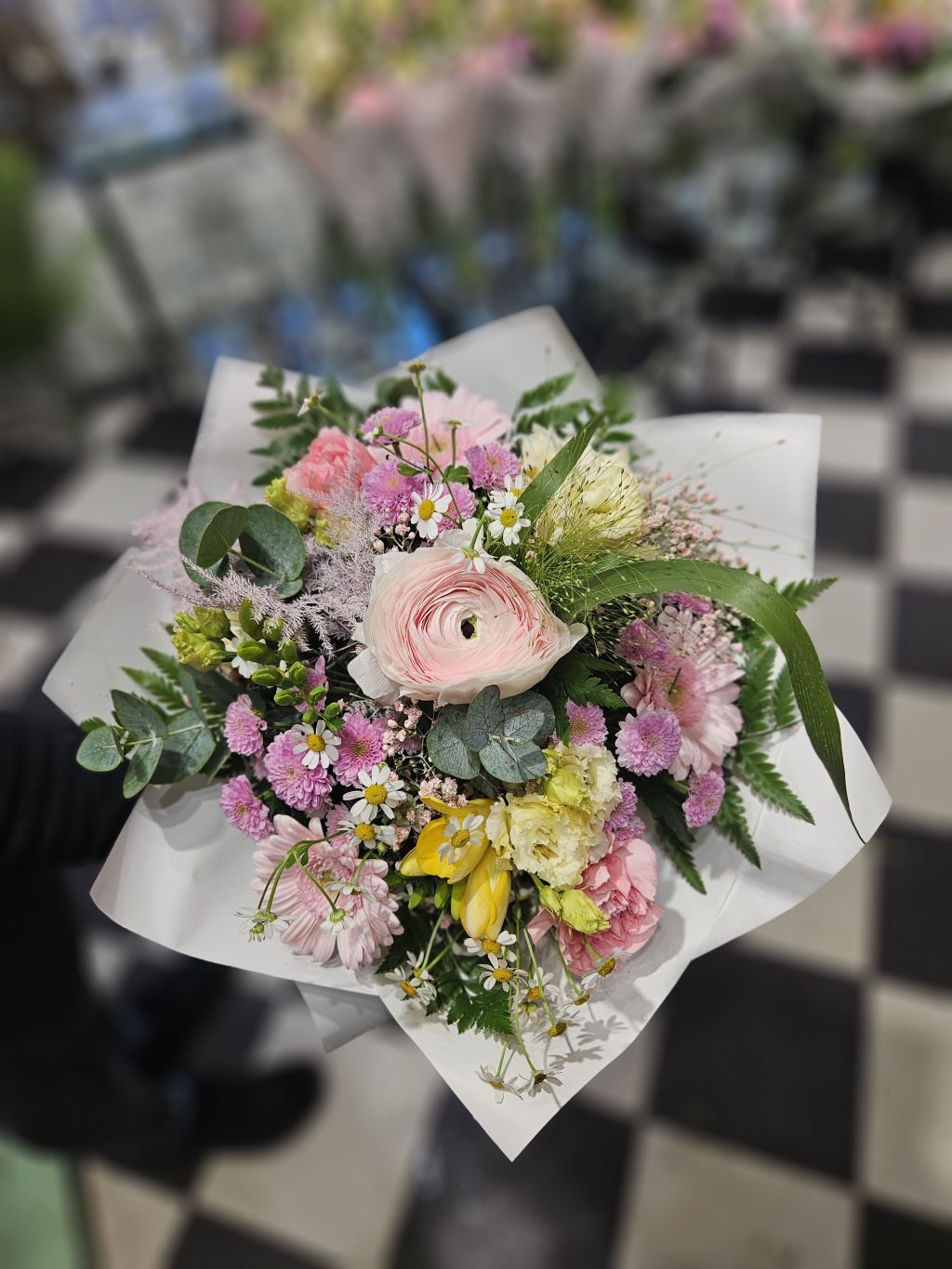 Uviazali sme iskerník, lysianthus, gypsomilka, frézia, kamilky, minigerbera, klinčeky.