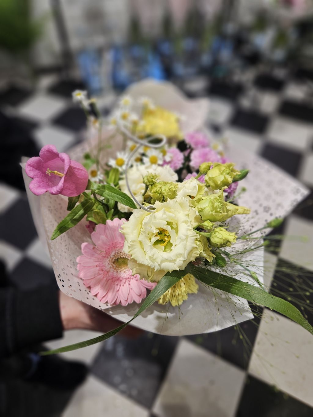Kytica z eustomy, kamiliek, minigerber, santiniek, zvončekov s klinčekov
