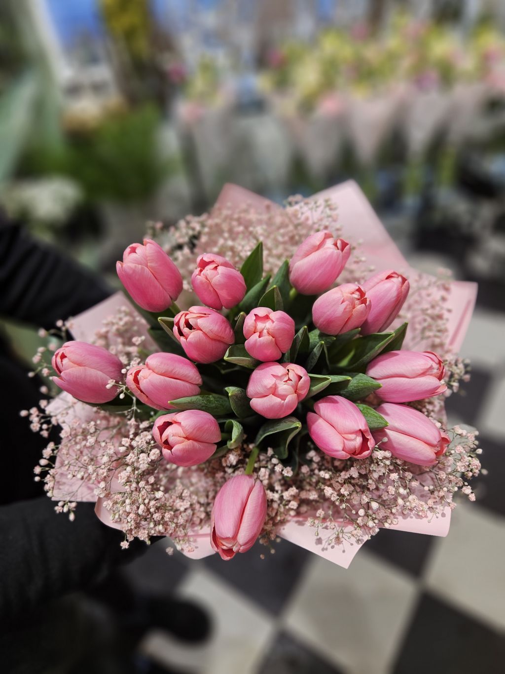 Donášková služba Tulipány 15ks s ružovou gypsomilkou