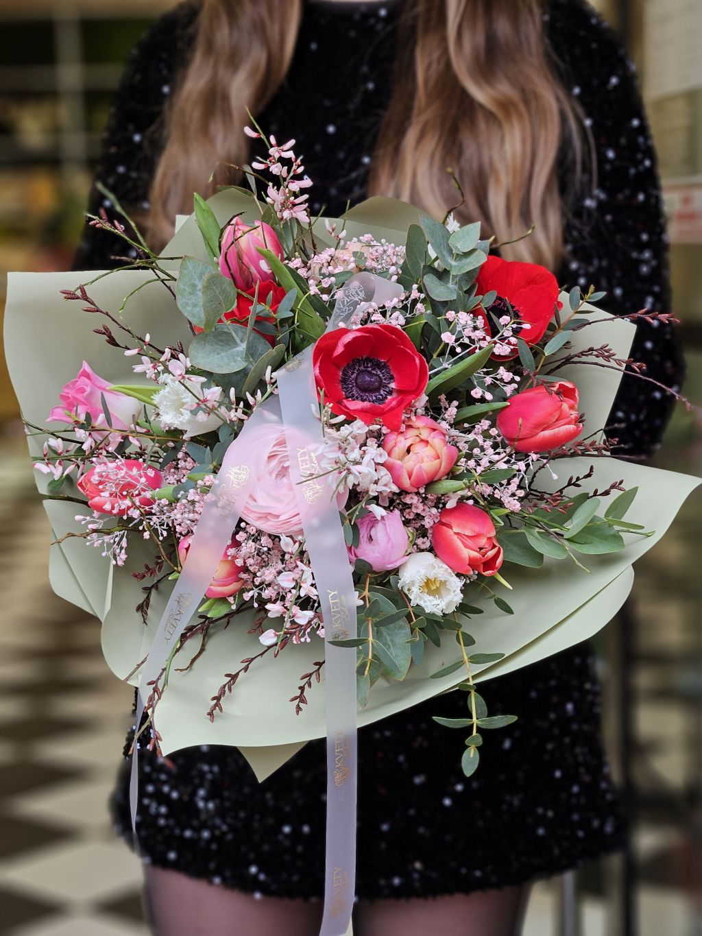 Kytica z tulipánov, frézia, iskerníka, amemonky, eucalyptus, čučoriedka. Kytica môže byť odlišná podľa dennej ponuky kvetov v kvetinárstve (farby kvetov)