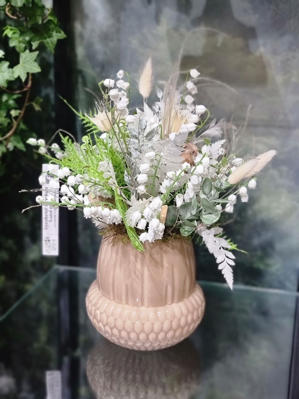 Naaranžovali sme pre Vás konvalinky v sklenenej nádobe . Aranžmán je trváci. Farba bielo-béžová, výška 30cm