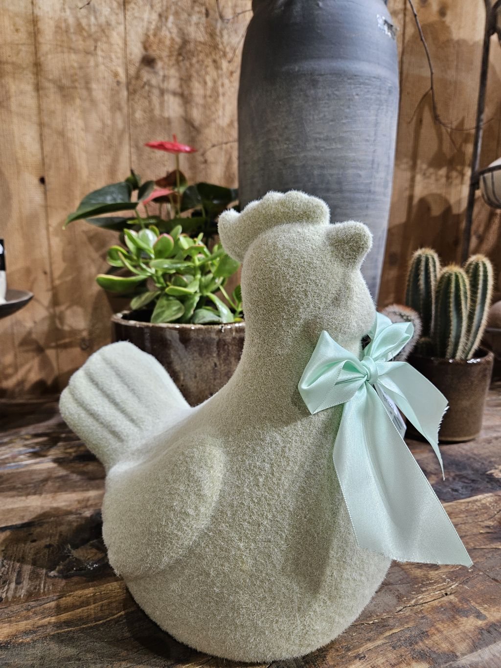 Chlpatá sliepočka v mentolovej farbe. Výška 30cm, dĺžka 26cm, šírka 19cm. Polystyrén.