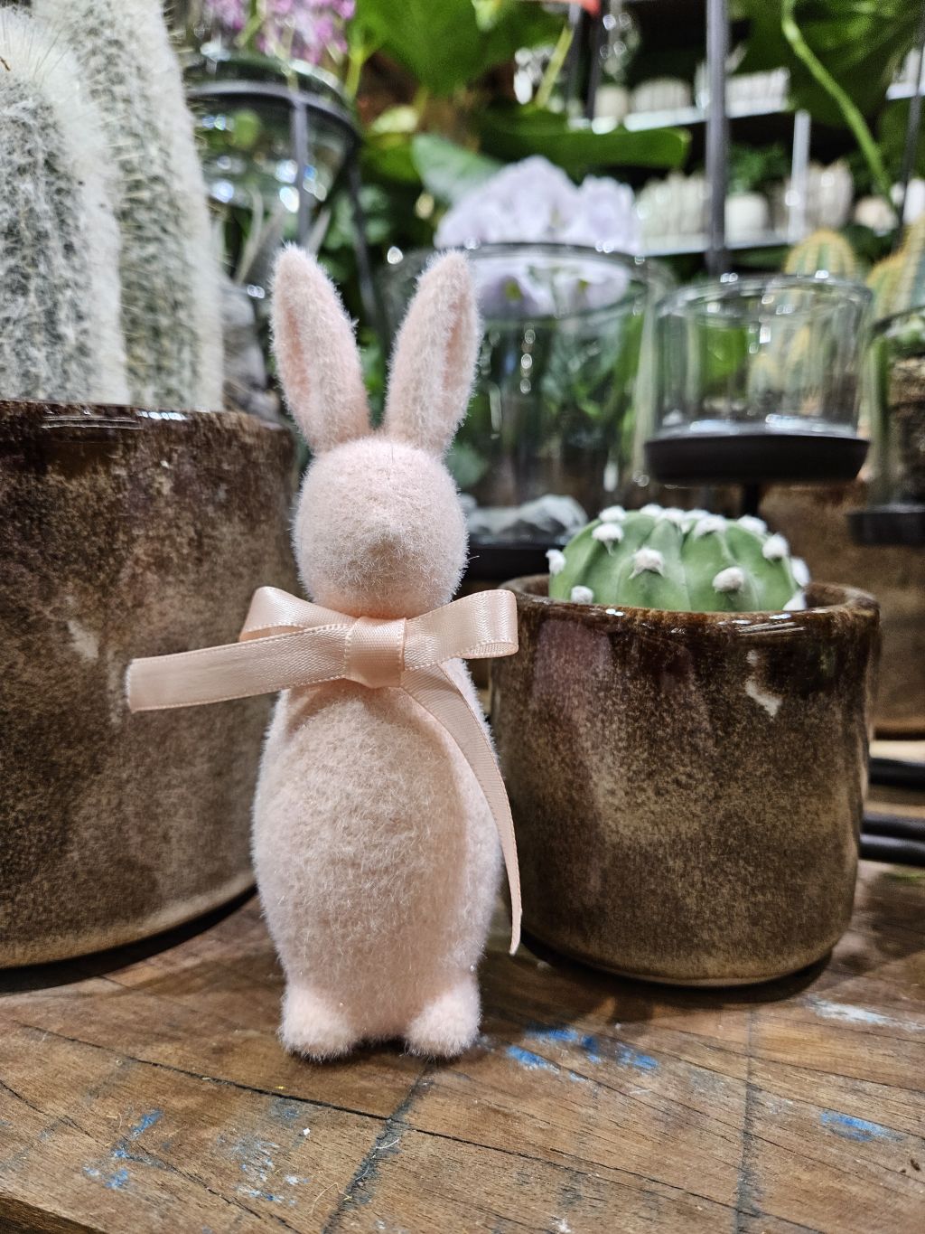 Chlpatý zajko ružovo-marhulovej farby. Výška 15cm. Polystyrén.