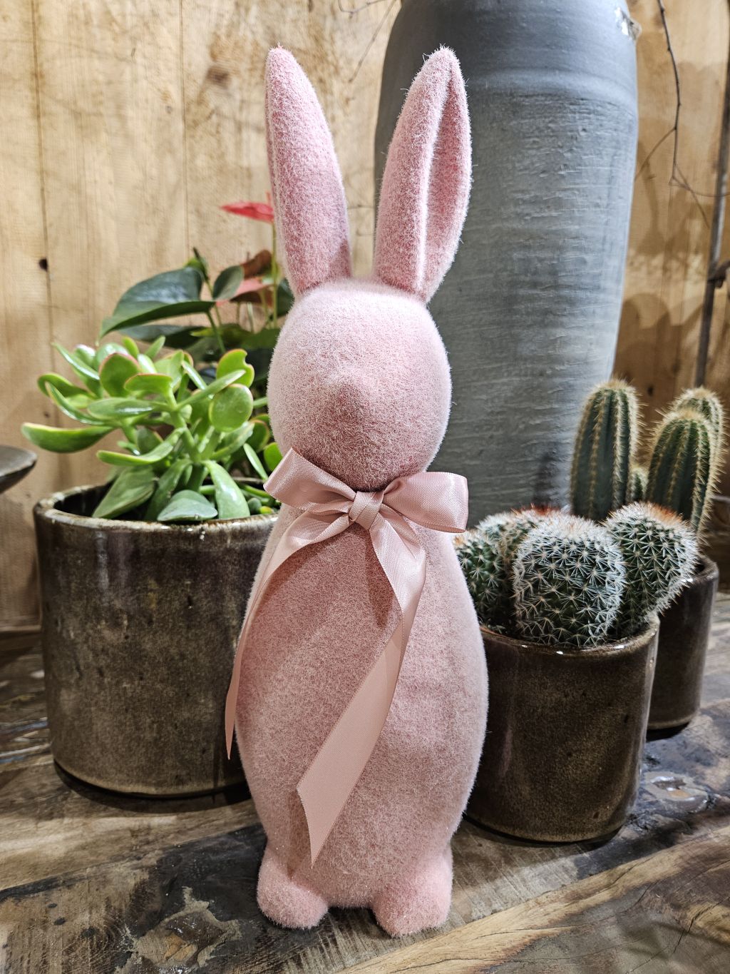 Chlpatý zajko v tmavoružovej farbe. Výška 40cm. Polystyrén.