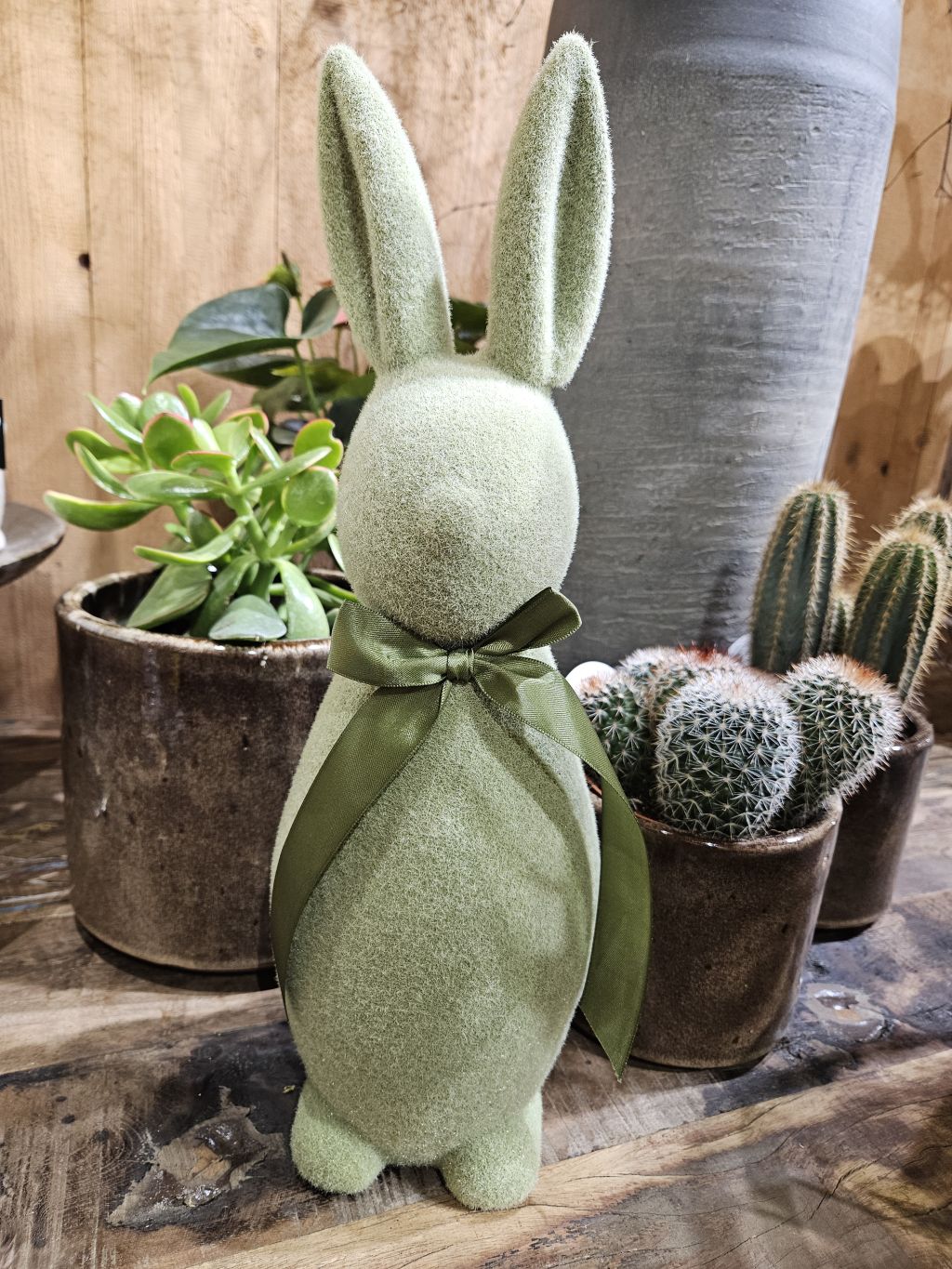 Chlpatý zajko v zelenej farbe. Výška 40cm. Polystyrén
