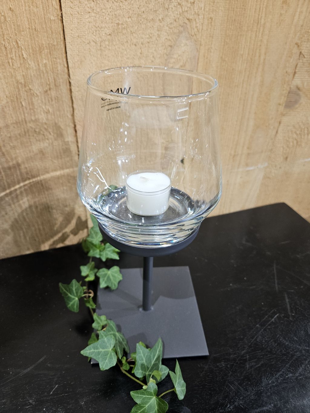 Svietnik zo skla na kovovej konštrukcii. Výška stojanu je 15cm, so svietnikom 26cm. Kahanček nieje súčasťou balenia.