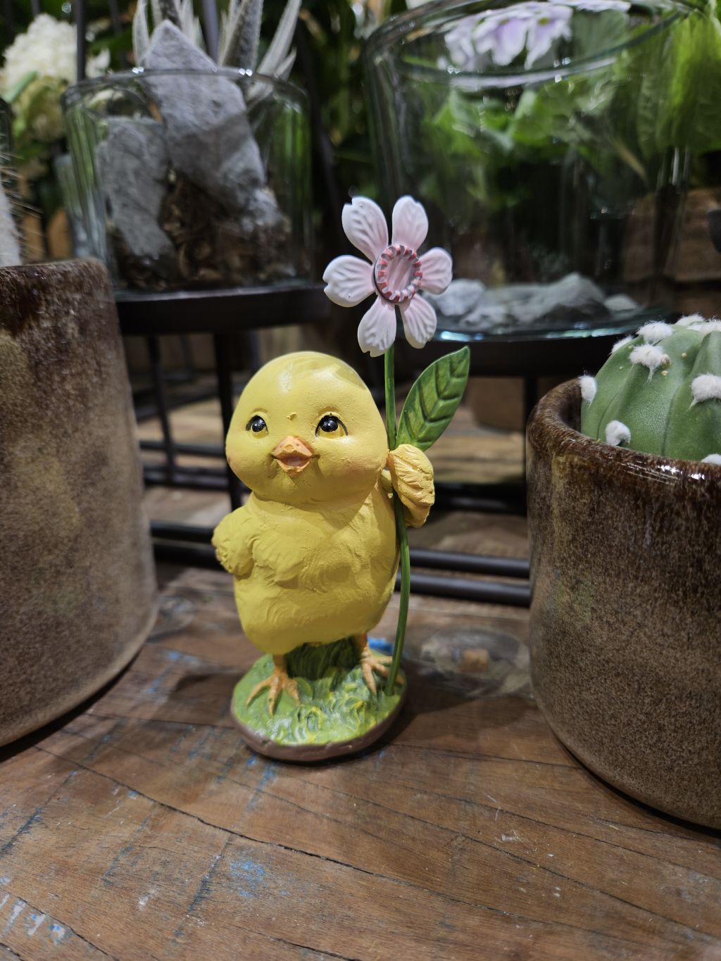 Keramické kuriatko s kvetom. Výška 13cm. Polyrezín, kvet je z kovu.