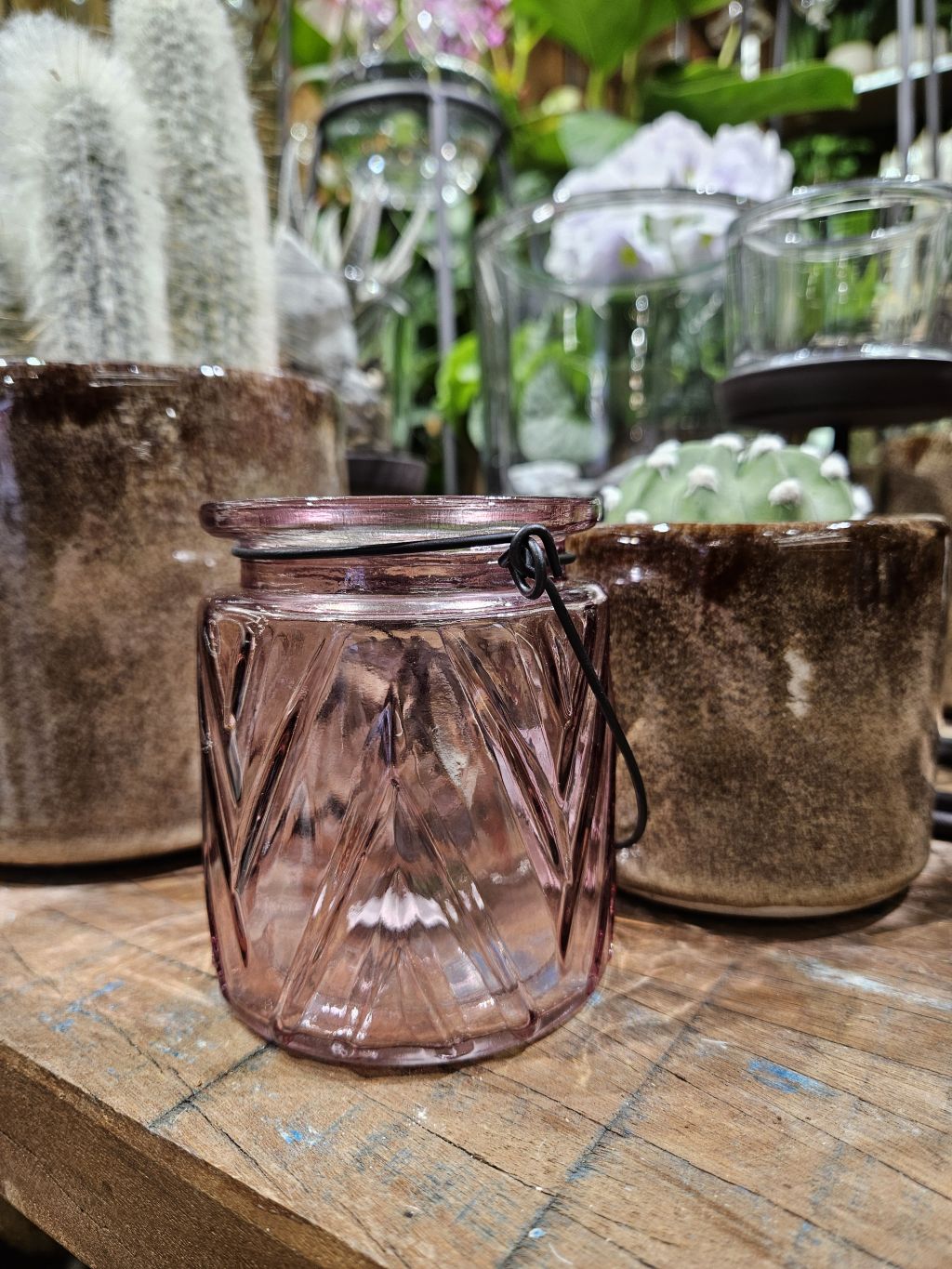 Lampášik na zavesenie v ružovej farbe. Výška 9cm. Sklo.