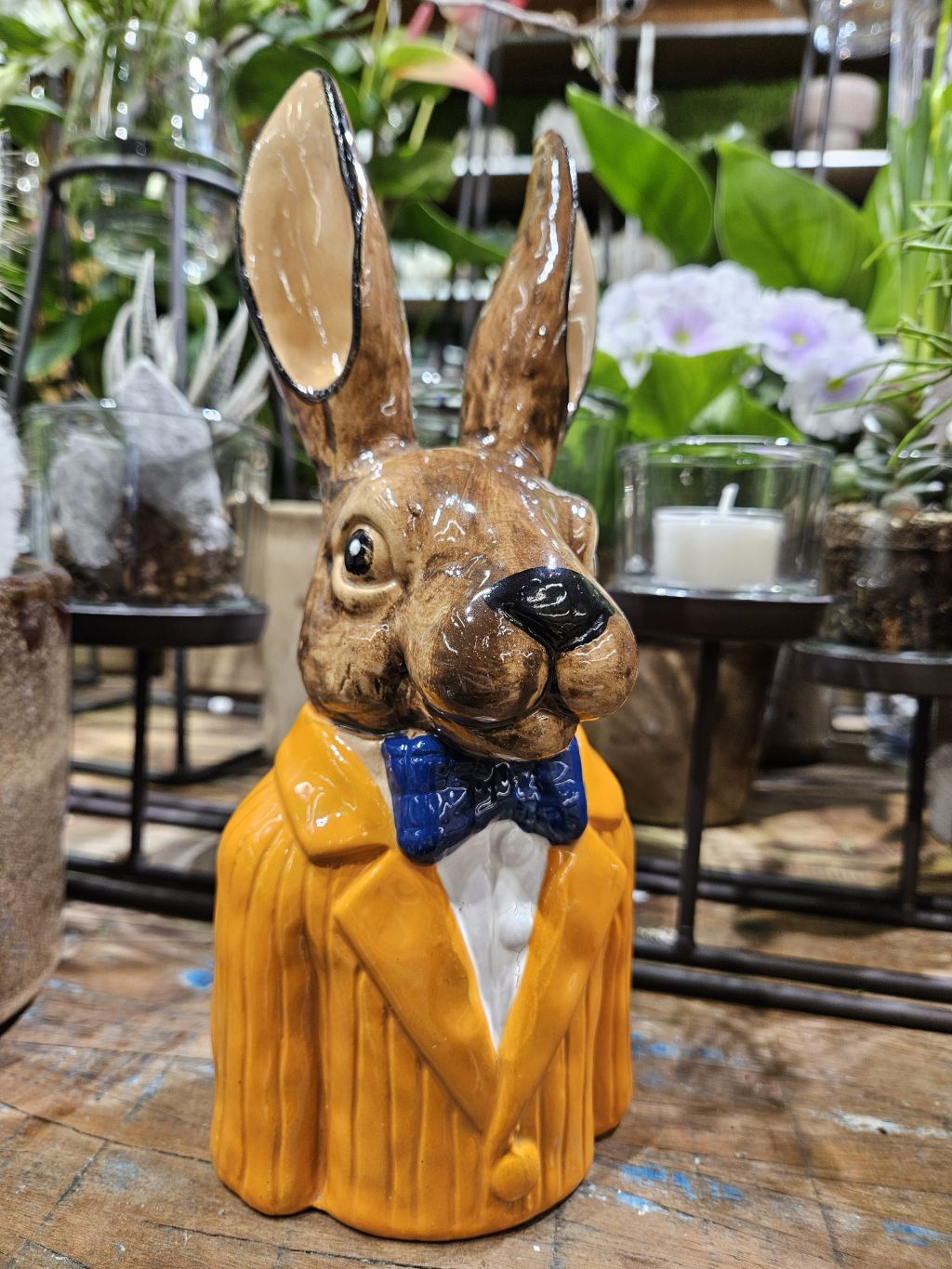 Keramický zajac v oranžovom obleku. Výška 25cm.