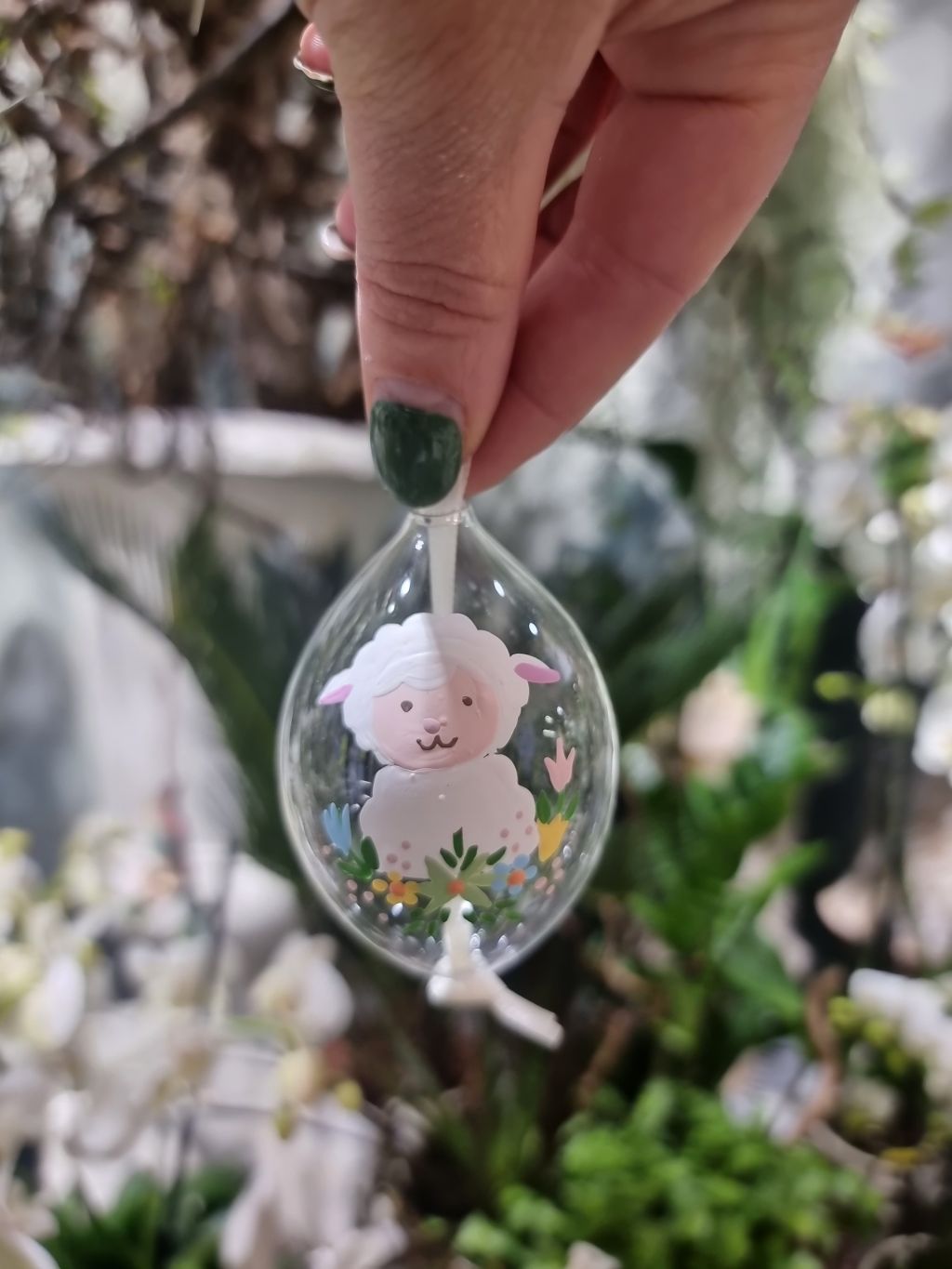 Ručne maľované sklenené vajíčko 8cm. Ovečka na lúke