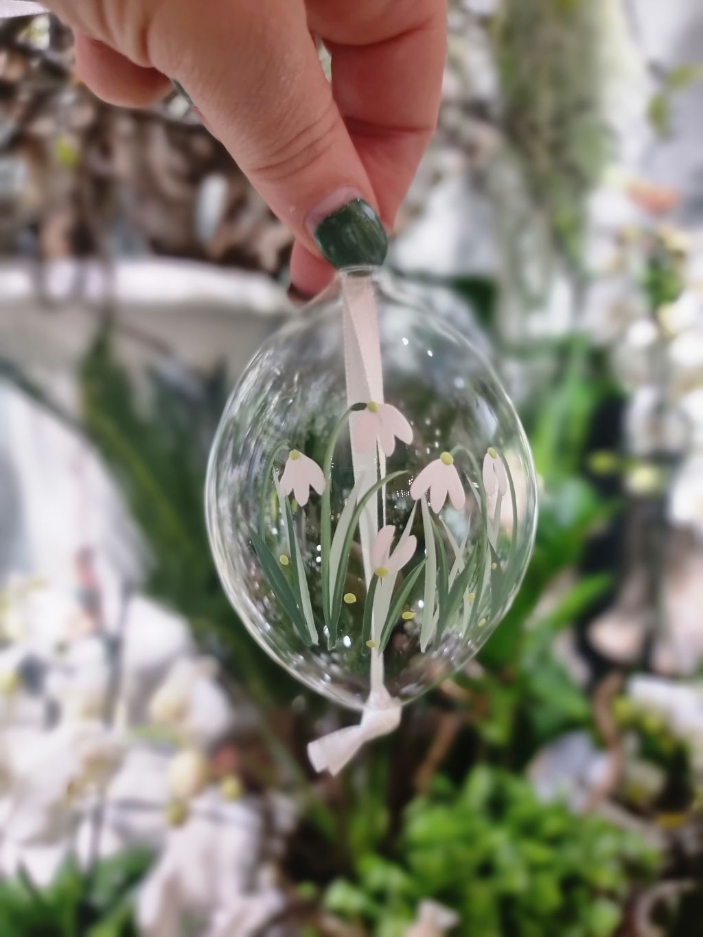Sklenené ručne maľované vajíčko.10cm Maľované snežienky