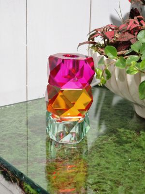 Sklenený svietnik na čajový kahanček Mentolový s farebnými vtáčikmi Výška 14,5cm , šírka 11,5cm