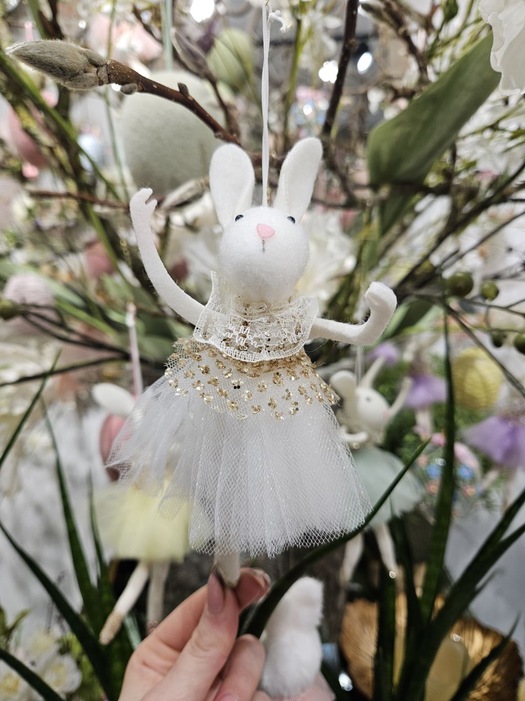 Pózujúca zajačica v bielych tylových šatách. Výška 18cm s uškami.