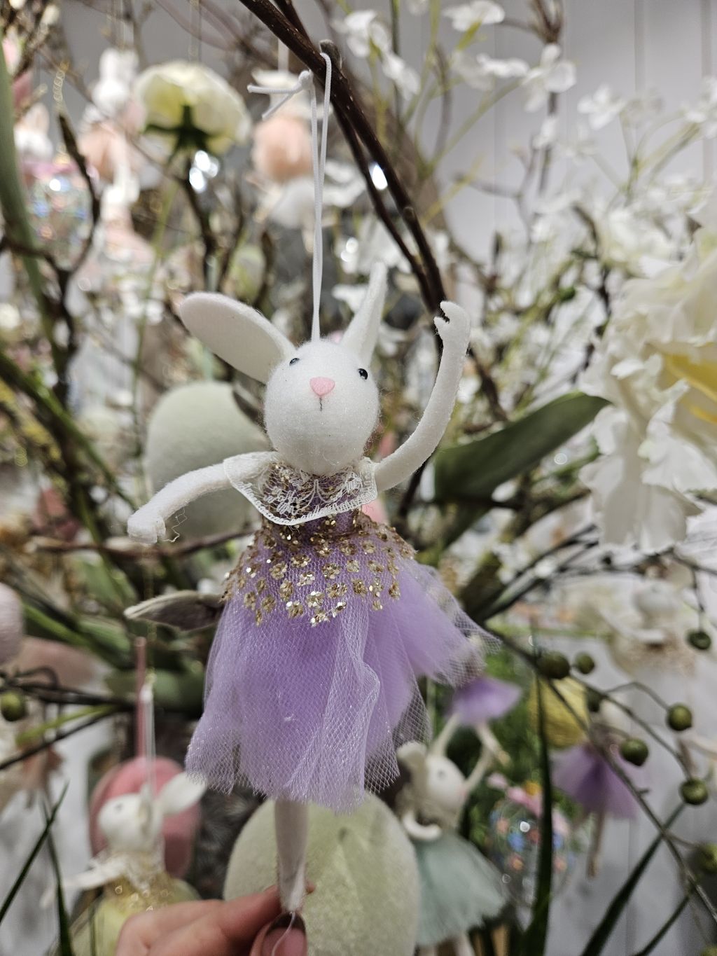 Pózujúca zajačica vo fialových tylových šatách. Výška 18,5cm s uškami.