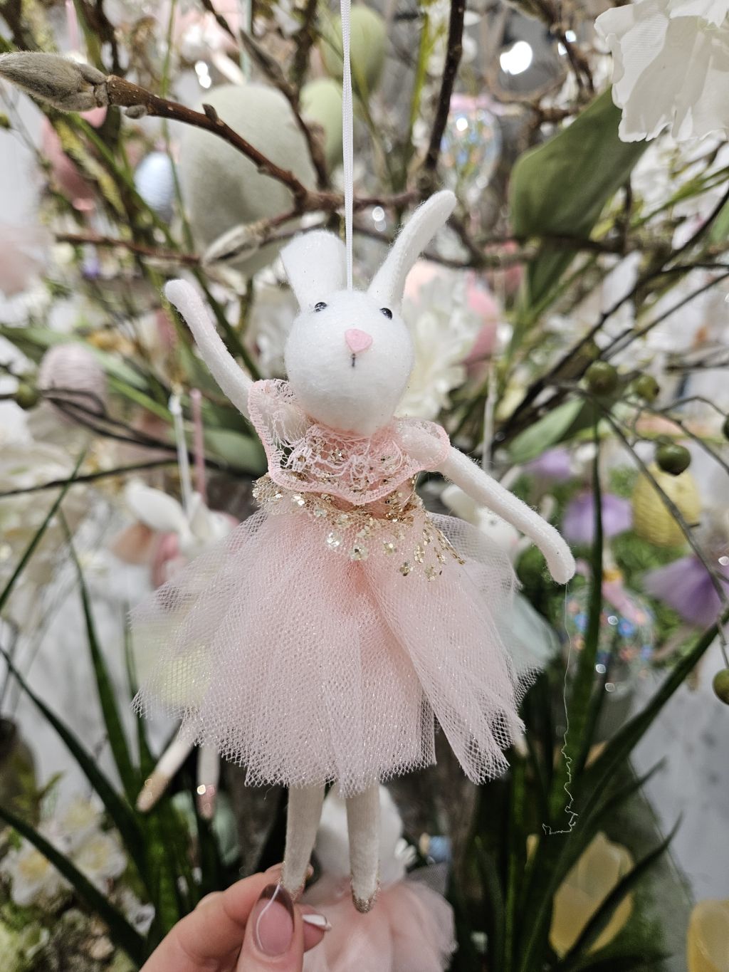 Pózujúca zajačica v ružových tylových šatách. Výška 18,5cm s uškami.