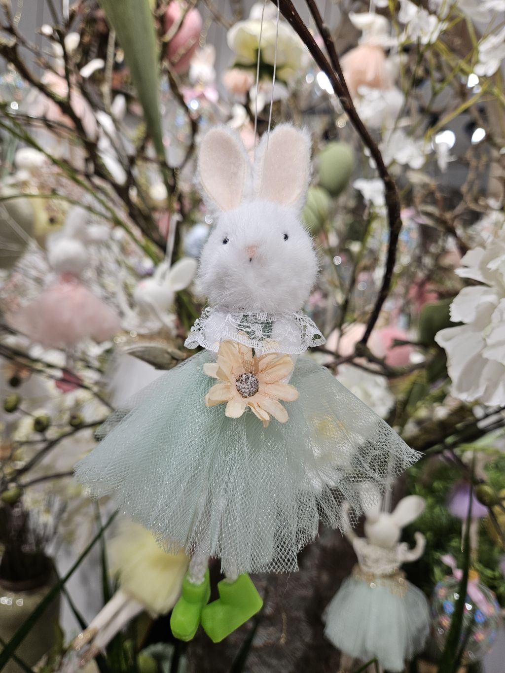 Zajačica v mentolových tylových šatách. Má šnúrkové nožičky s plastovými topánočkami. Výška 19cm s uškami.