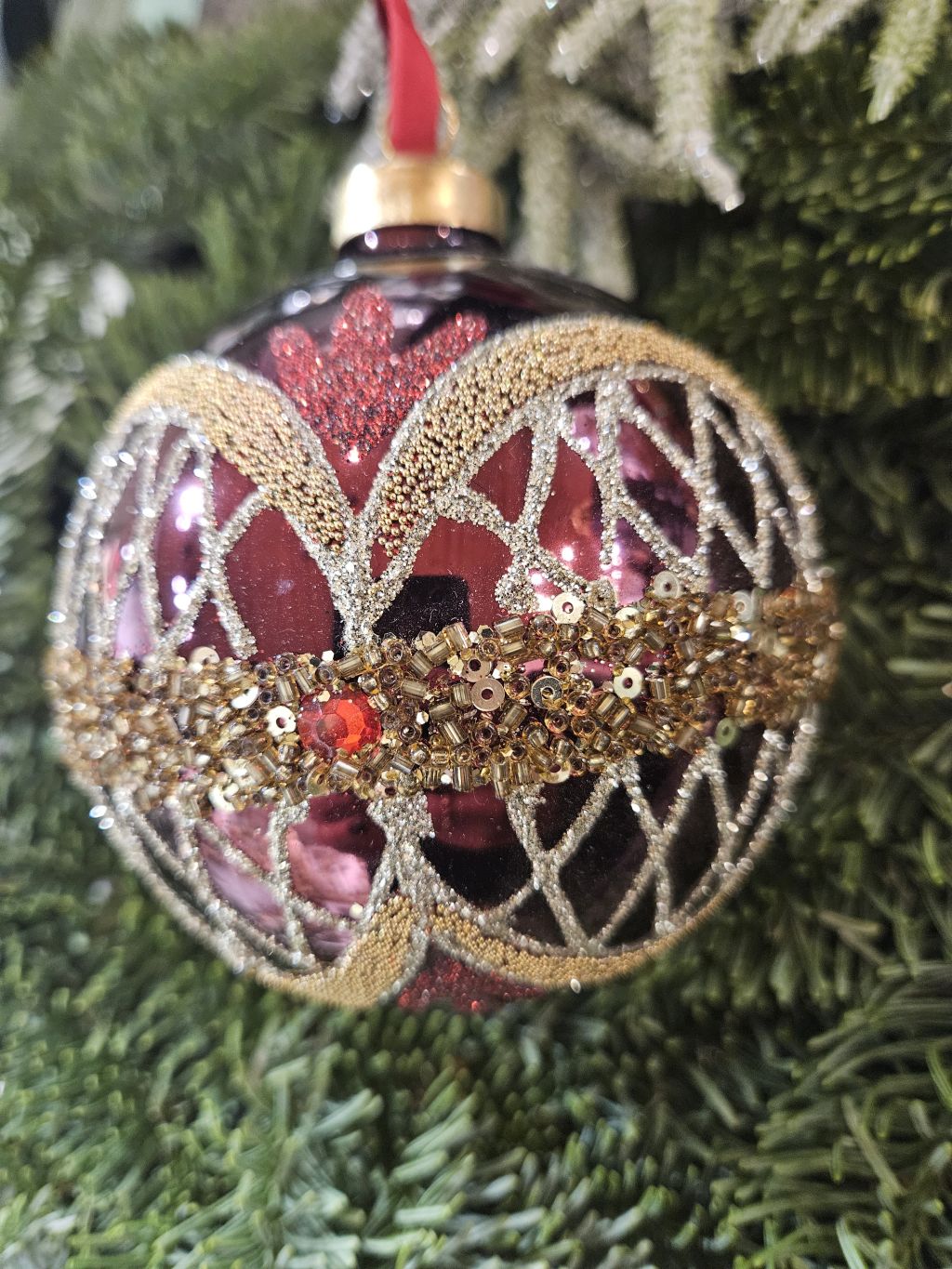 Zdobená sklenená gulička bordová