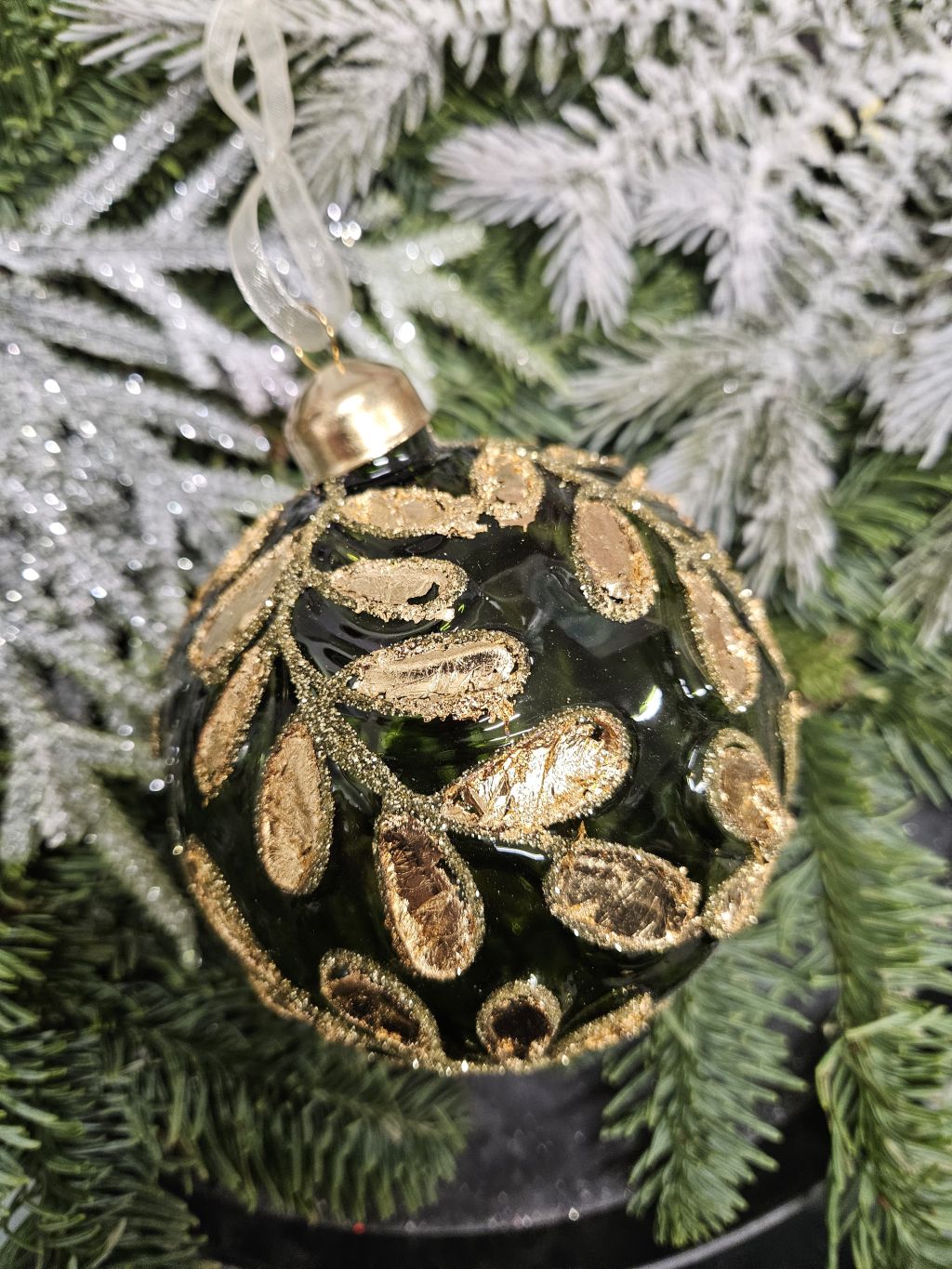 Zdobená sklenená gulička smaragdová so zlatom