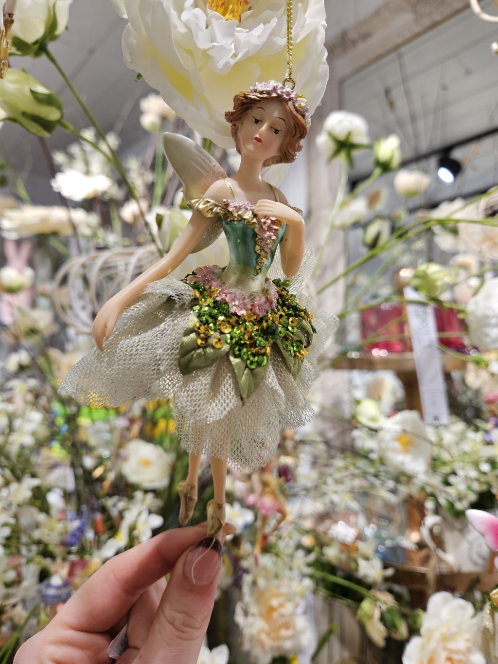 Víla v zelenkavých šatách, na zavesenie, výška 16cm, polyrezín.