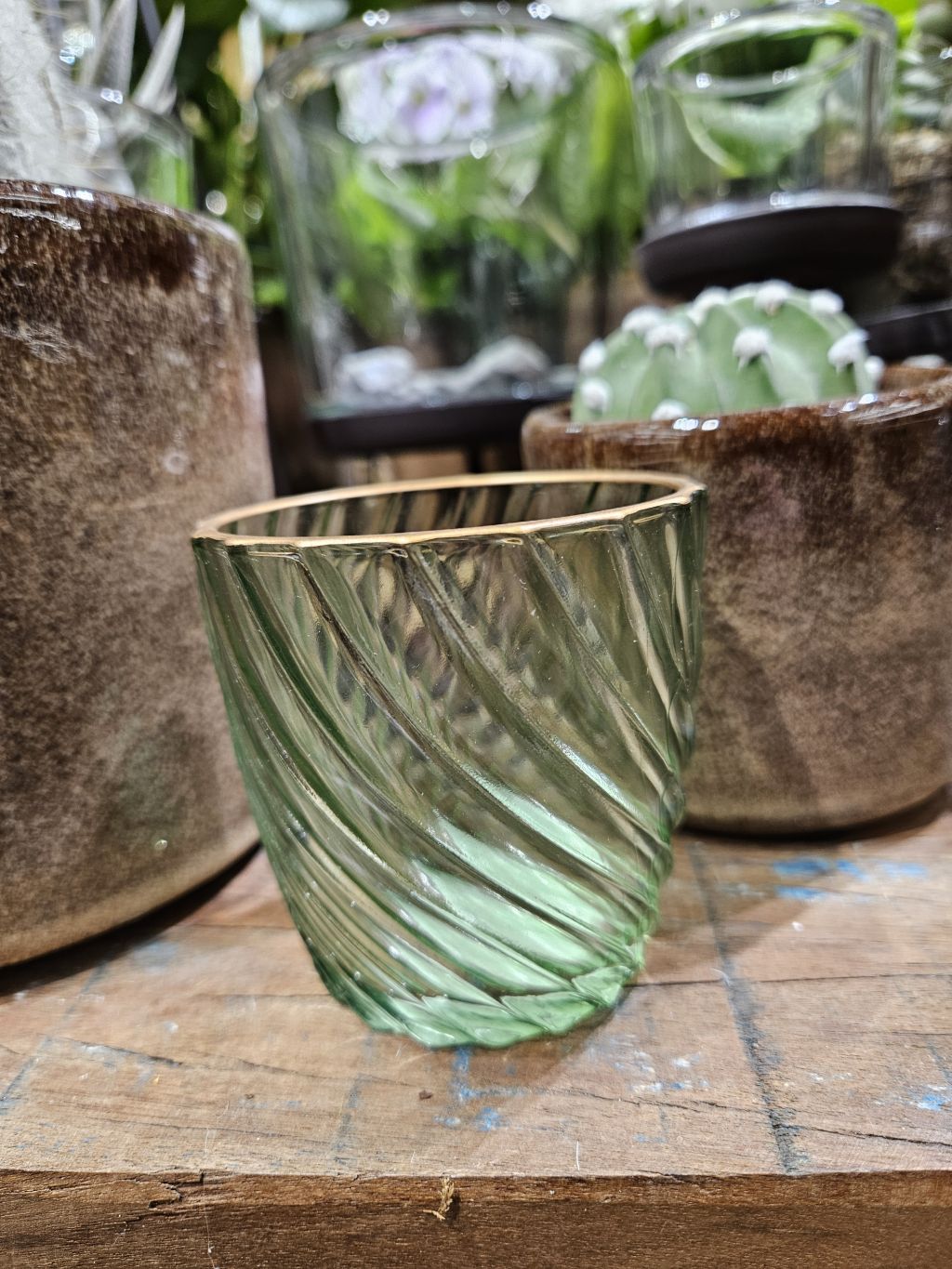 Zelený svietnik so zlatým lemom. Určený na čajový kahanček. Výška 7cm. Sklo